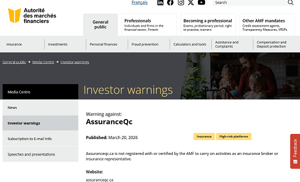 Quebec’s Autorité des marchés financiers (AMF) has officially flagged AssuranceQc, operating via assuranceqc.ca, as an unregistered and unlicensed entity offering insurance products and services without proper authorisation. Investors and consumers searching for assurance automobile, assurance Desjardins auto, assurances étudiants, or assurances auto Desjardins téléphone are landing on a platform that operates entirely outside the law and provides zero consumer protection.