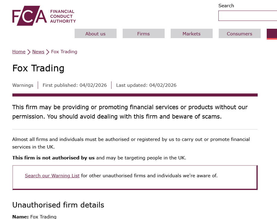 The UK Financial Conduct Authority (FCA) has flagged Fox Trading, warning consumers that the firm is not authorised to provide financial services in the UK.