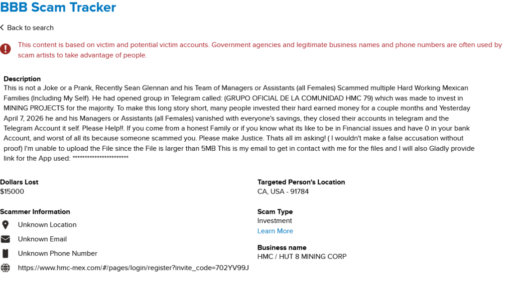 Reports involving HMC / HUT 8 Mining Corp and the domain hmc-mex.com have raised concerns among investors who claim to have lost funds through a cryptocurrency mining investment program.