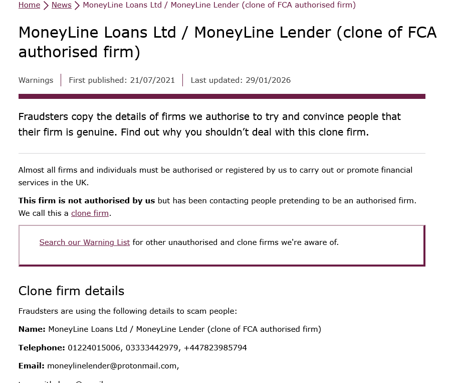 MoneyLine Loans Ltd / MoneyLine Lender is a clone firm impersonating the authorised lender East Lancashire Moneyline (IPS) Limited.𝐀𝐯𝐨𝐢𝐝 dealings with it and always verify loan offers using official regulatory tools. Your financial safety depends on it. (FCA)