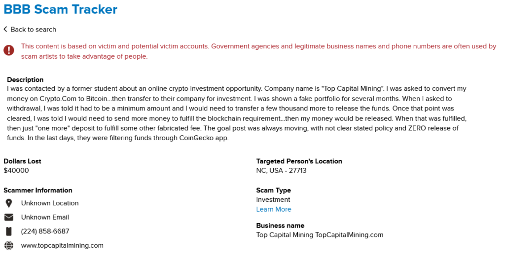The BBB report filed against Top Capital Mining exposes a precise and calculated operation that targets victims through trusted personal networks before systematically blocking every attempt to access their funds.